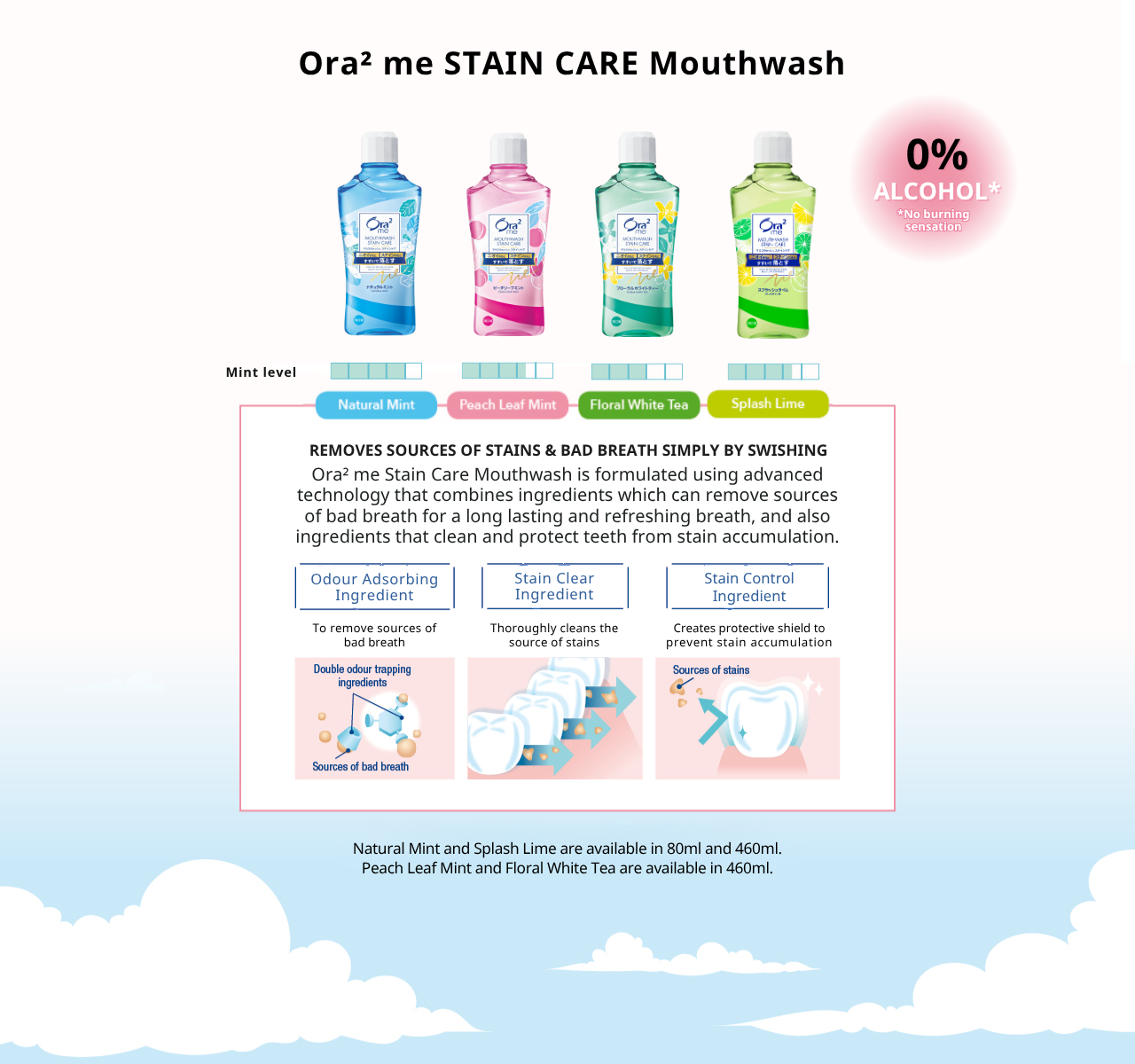 Mouthwash to remove sources of bad breath.(Ora² me STAIN CARE Mouthwash)