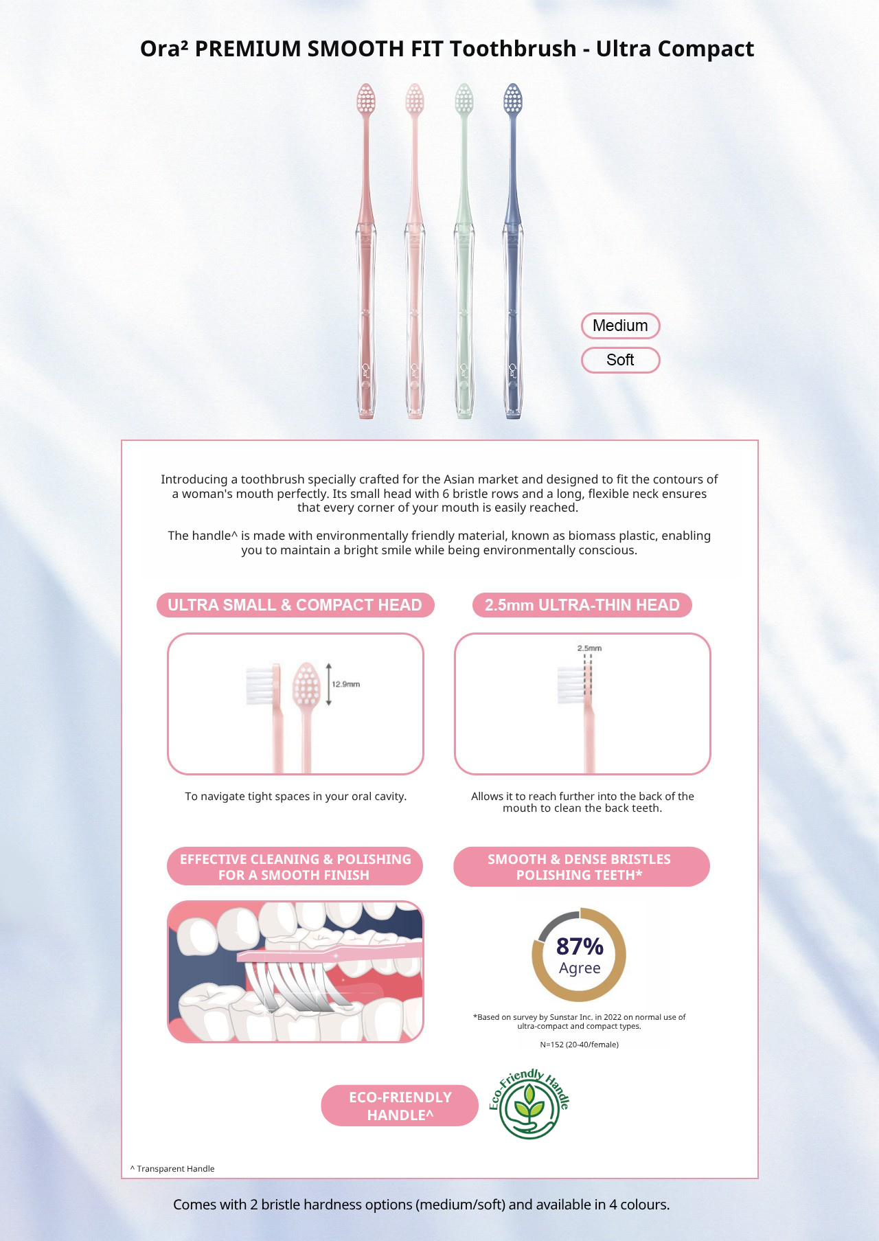 Pastel hues and the slimmest design for the stylish you.(Ora² PREMIUM SMOOTH FIT Toothbrush)