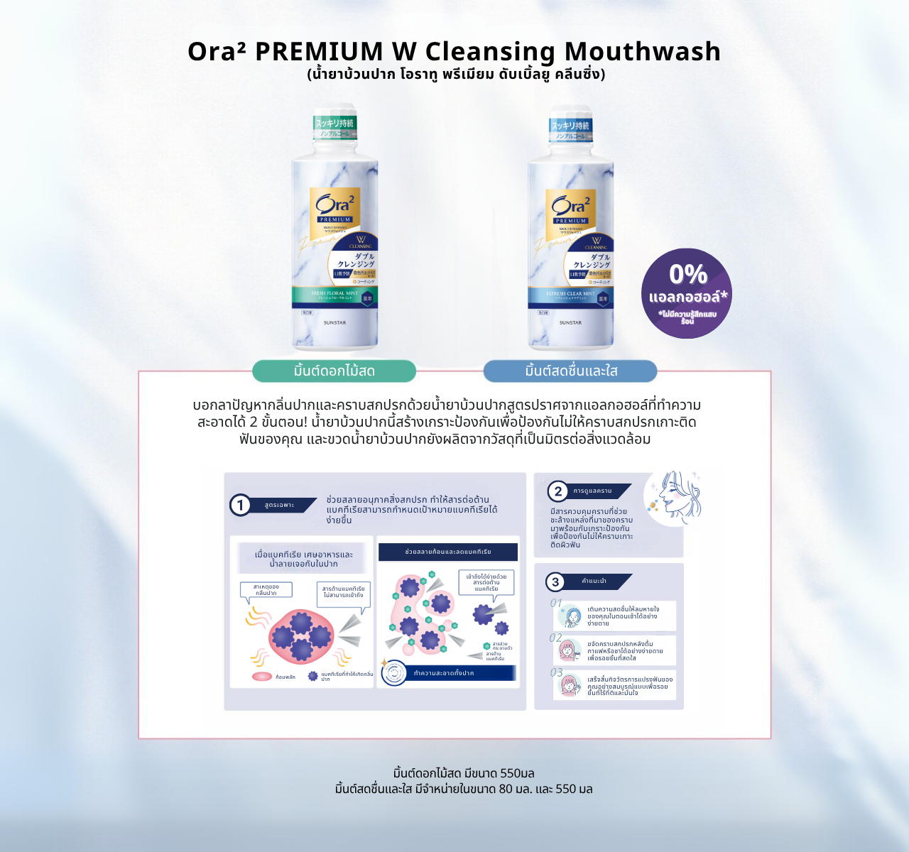 ป้องกันคราบสะสมบนผิวฟัน และขจัดต้นตอของกลิ่นปาก (Ora² PREMIUM W Cleansing Mouthwash)
